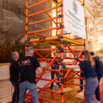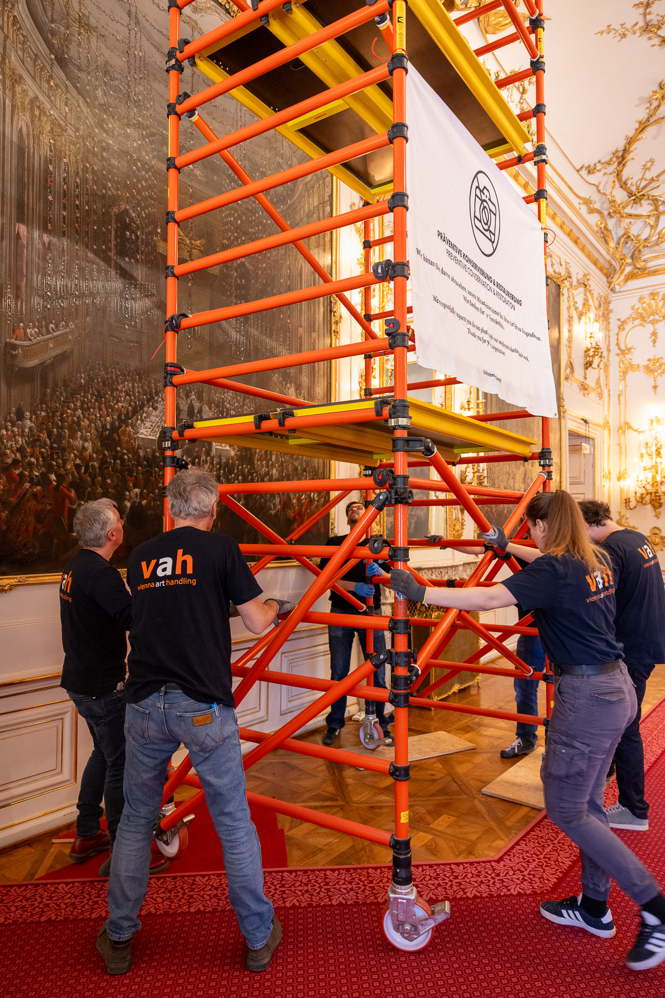 „Bei der Suche nach einem Arbeitsraum, der sowohl in seinen Dimensionen ausreichend groß ist als auch ein möglichst ungestörtes und sicheres Arbeiten ermöglicht, erwies sich der nahe zum Zeremoniensaal gelegene Salon Franz Karls als ideal. Glastüren trennen ihn vom Besucherstrom ab, und mit seinem nahezu quadratischen, ausreichend großen Grundriss ermöglicht er die zeitgleiche Bearbeitung der etwa drei mal vier Meter großen, nun auf Staffeleigerüsten montierten Gemälde“, so Martin Siennicki, Restaurator der Schönbrunn Group. Um die Restaurierung der Wandvertäfelungen und der Decke unter bestmöglichen Bedingungen durchführen zu können, wird der Zeremoniensaal in den kommenden Wochen in eine „Raum-in-Raum“-Konstruktion eingebettet. Diese architektonische Lösung in Form eines Gerüstes mit Plattform ermöglicht es den Besucher*innen, den Raum weiterhin zu durchqueren – trotz der laufenden konservatorischen Arbeiten und ohne Einschränkung ihres Rundgangs. Der Abschluss der Arbeiten wird Ende 2026 erwartet.