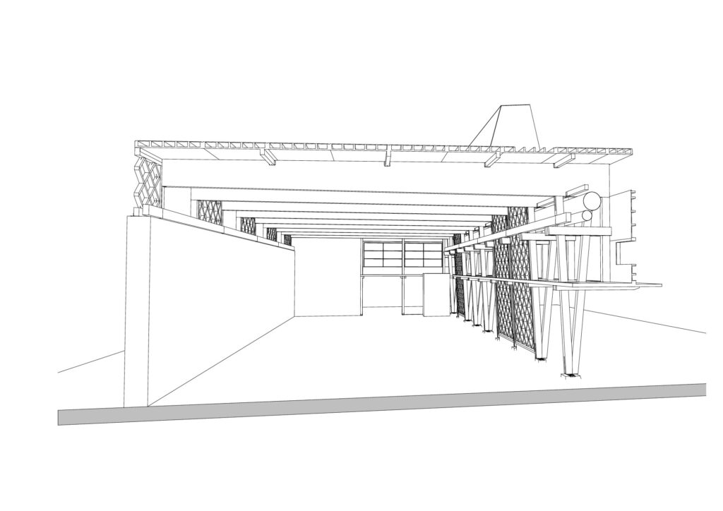 Die Hallennordseite hingegen basiert auf einer einhüftigen BSH-Rahmenkonstruktion aus V-förmig platzierten Stützen mit integrierter Galerie, die die Vertikallasten abträgt. Die Aussteifung des BSH-Tragwerks in Hallenlängsrichtung stellen in die Holzkonstruktion integrierte, werkseitig vorproduzierte BSH-Rautenfachwerke sicher, die an die BSH-Stützen geschraubt wurden. Die Dämmung der Holzkonstruktion erfolgte mittels vor Ort in ein Lehmbad getauchter und händisch zwischen die Gefache eingebrachter Hackschnitzel.