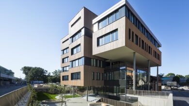 Bei einem Schulhaus in Wien schaffen schlanke Profile und Brandschutzelemente einen betonten Kontrast an den Fassaden und im Innenraum.