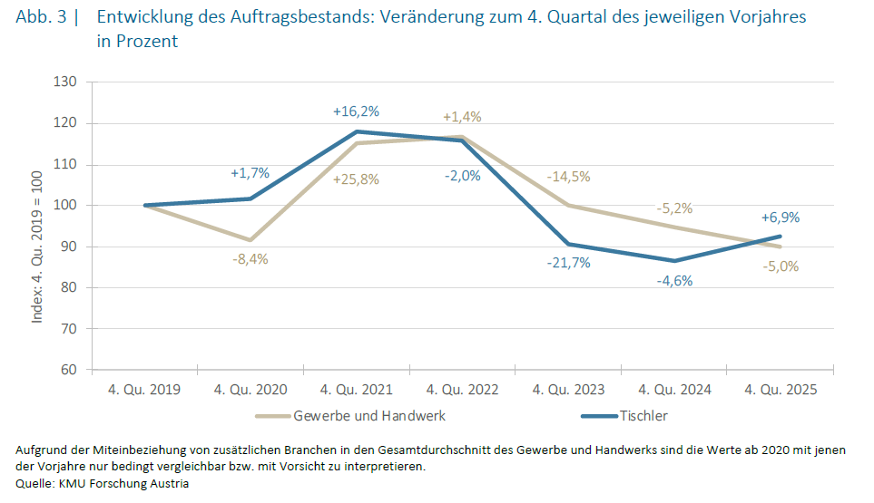 Diese Themen standen auch im Zentrum des Pressegesprächs der Bundessparte Gewerbe und Handwerk Ende Jänner in der WKÖ bei der aktuelle Zahlen der KMU Forschung Austria vorgelegt wurden. Neben einer nüchternen Analyse der aktuellen Konjunkturdaten wurde dabei deutlich: Die Tischlereibranche steht vor strukturellen Herausforderungen, die über das Quartalsergebnis hinausreichen.