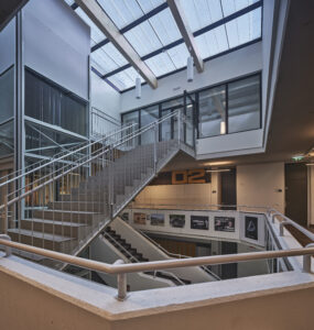 Die Luft strömt in das zentrale Treppenhaus aus den Klassenräumen über und wird dort abgesaugt. Im Hochsommer gibt es Deckenventilatoren. Mit dieser Ergänzung kann man aus den 28-29 Grad, die ohne Klimaanlage auch mal bei zwei heißen Sommerwochen am Stück entstehen, gefühlt 26, 27 Grad machen. Das Komfortempfinden verbessert sich durch Luftbewegung deutlich.